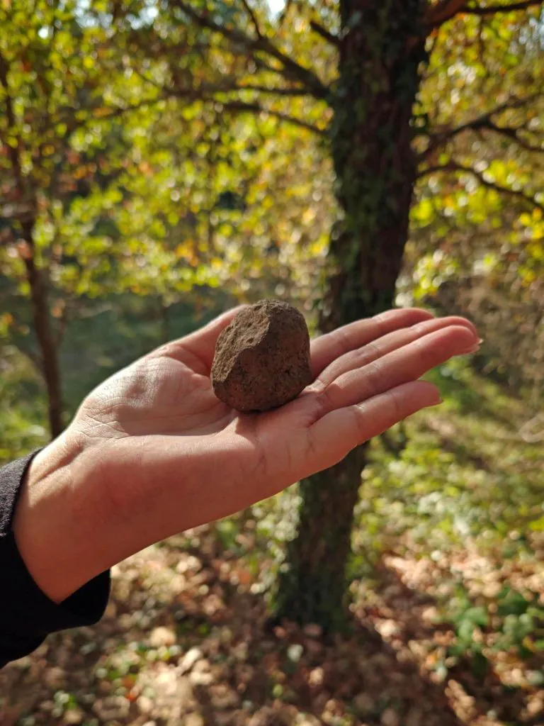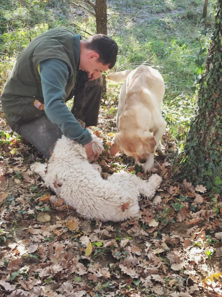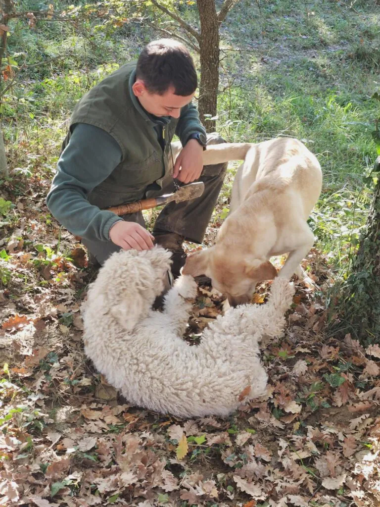 In the past, pigs were used to hunt truffles because of their exceptional sense of smell. Nowadays, however, truffle hunting is done with dogs, specifically females, as they are more reliable than males. The choice of breed is not simple, either. Mixed breeds are usually chosen over purebreds because they are more obedient and have a more refined sense of smell. The best hunting breed is the Lagotto Romagnolo, or Italian water dog. Training begins when the dogs are about 3 months old and is carried out by their future handler. Although training is serious, it is carried out in such a way that it seems like a playful game to the dogs. We saw this for ourselves when we watched them joyfully jumping and rolling in the leaves. 😊 When a dog smells a truffle and starts digging, the handler joins in to continue digging; otherwise, there is a risk that the dog will eat the truffle.