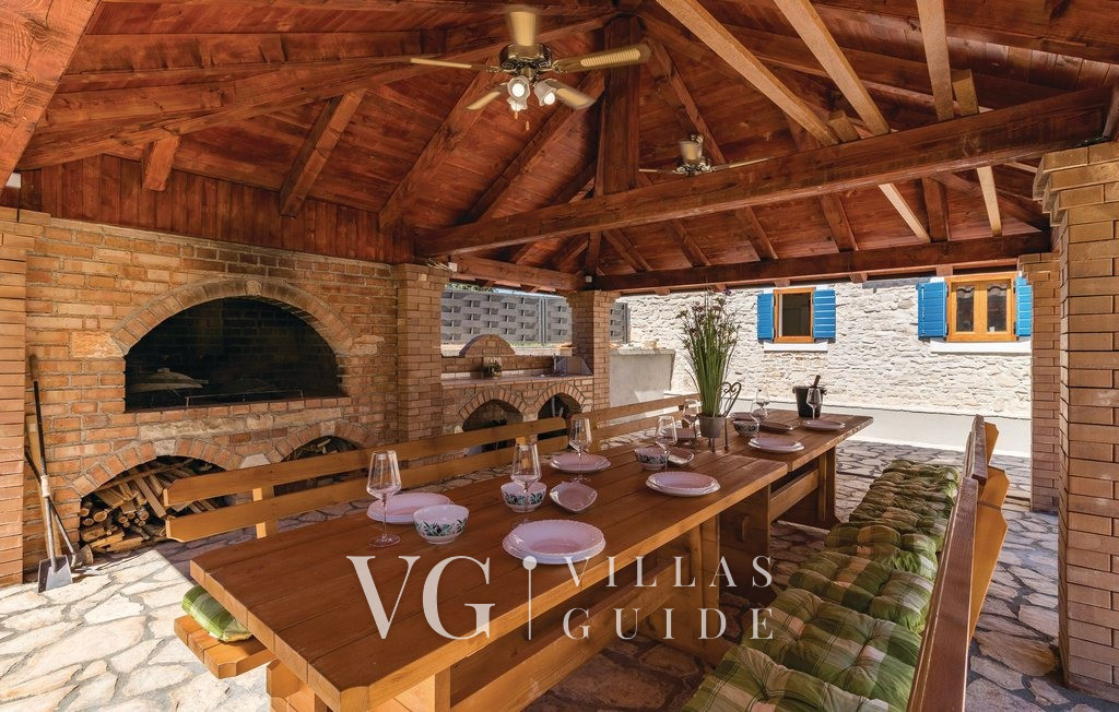 In the heart of Istria, close to the town of Tinjan, you will find a spacious, modern villa which can accommodate up to eight people. It has four bedrooms and four bathrooms. The villa features a Finnish sauna, an outdoor kitchen, a barbecue and a covered terrace. You can have fun playing pool, mini golf or darts, or get some exercise in the fitness room. Pets are also welcome at this villa.