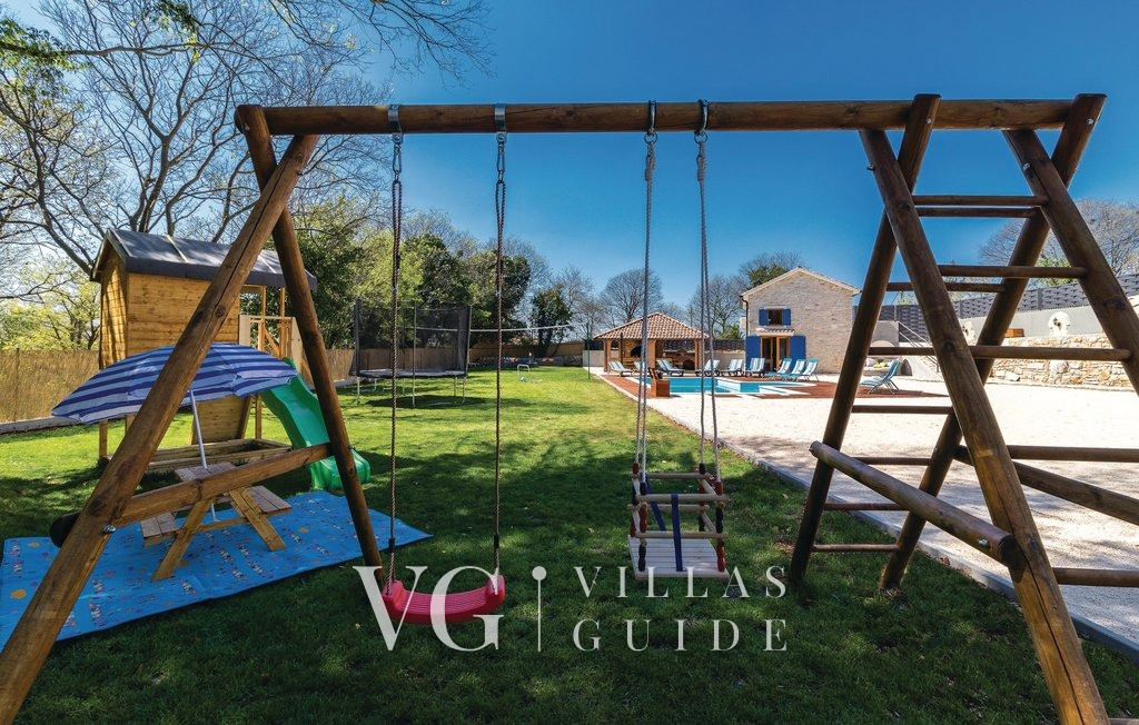 This villa is located in Svetvinčenat, in the heart of Istria. With four bedrooms and four bathrooms, it can accommodate up to ten people. The villa offers plenty of entertainment options, even in the colder months of the year. Guests can enjoy a sauna and a hydromassage pool, as well as table tennis, pool, table football, darts and mini-football goals. Children will be glad to see the small playground with slides. Pets are also welcome at this property.