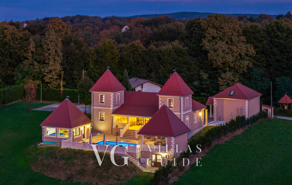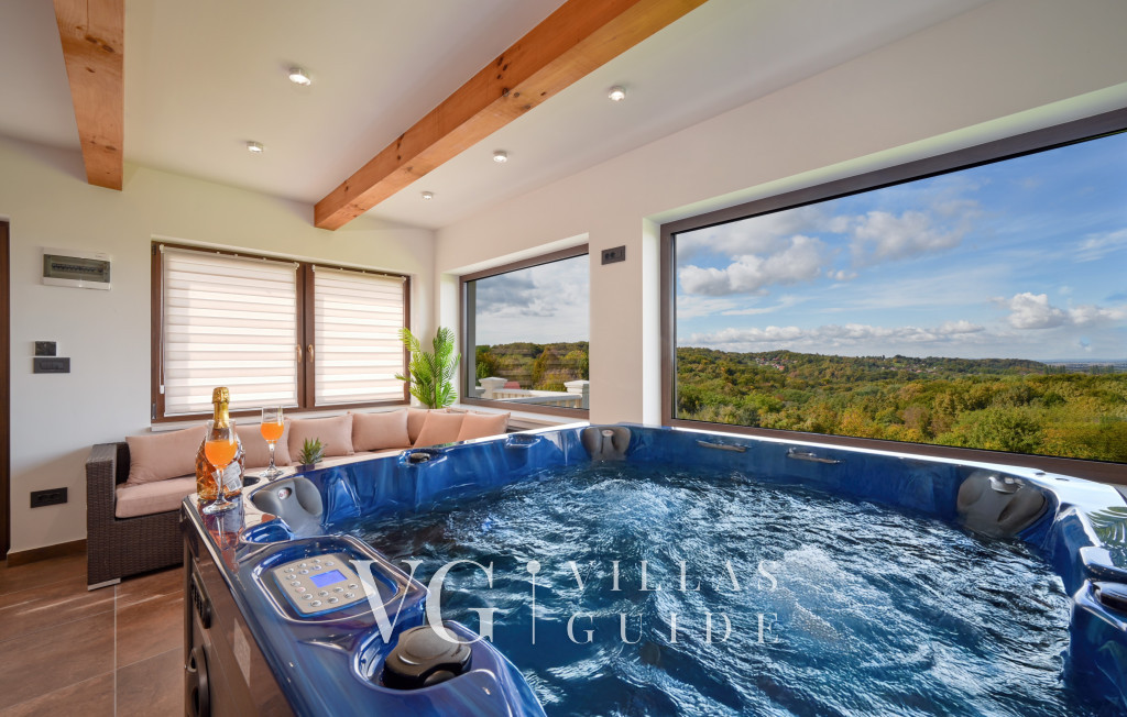 This picturesque villa, which has four bedrooms and three bathrooms, is located near Varaždin and can accommodate up to ten people. It has a wellness area with an infrared sauna and a hot tub. There is also a separate entertainment room equipped with a football table, a PlayStation console, darts and various board games. There are also many cycling and hiking trails in the area.