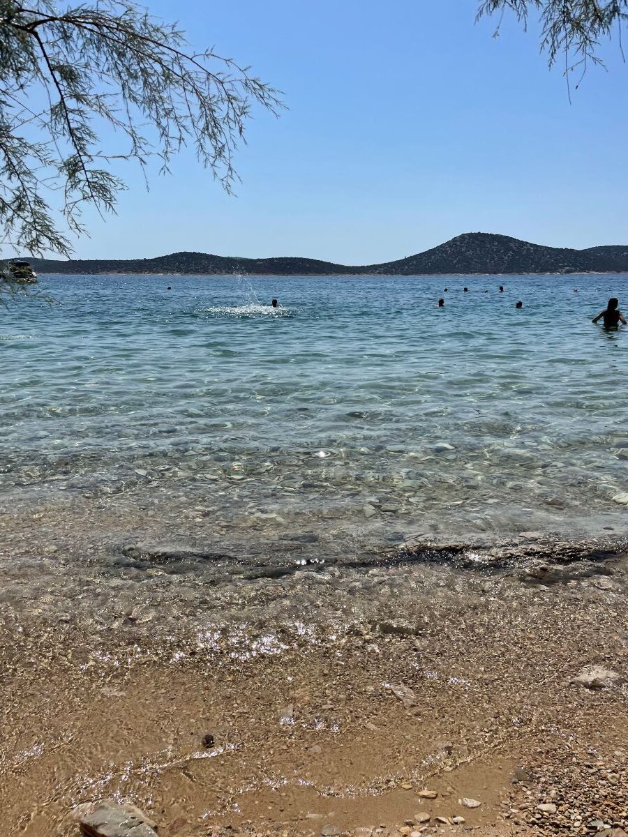 Beach Podvrške (island of Murter) – On the beach – towel on towel, at least in the morning when there’s still shade. Shallow entrance to the sea and great depth for doing handstands (for those who like 😋). The beach has fine pebbles, there is a café, a restaurant, and many stands selling fast food and ice cream. There is an inflatable water park in the sea. Parking is charged.