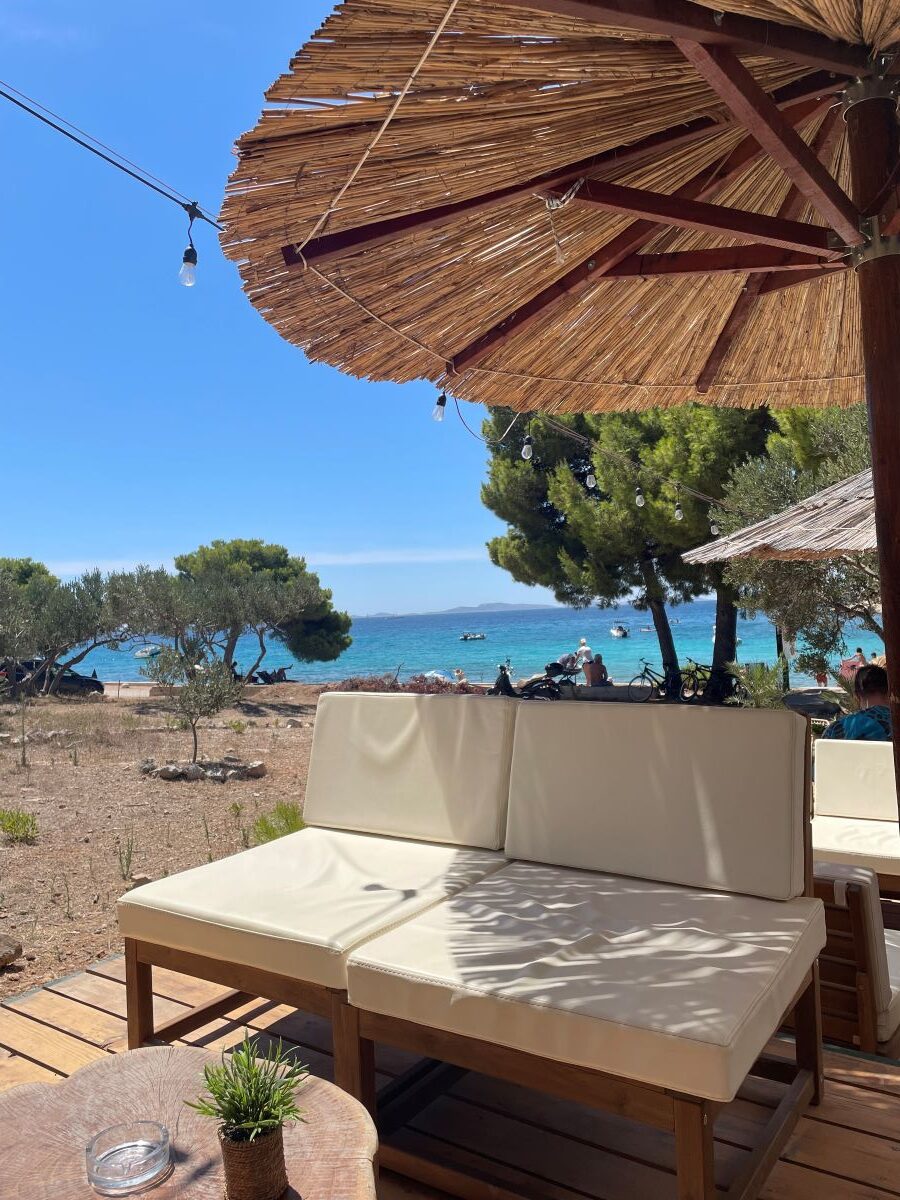 Crystal-clear sea on the island of Prvić and a beach bar with a view on Murter