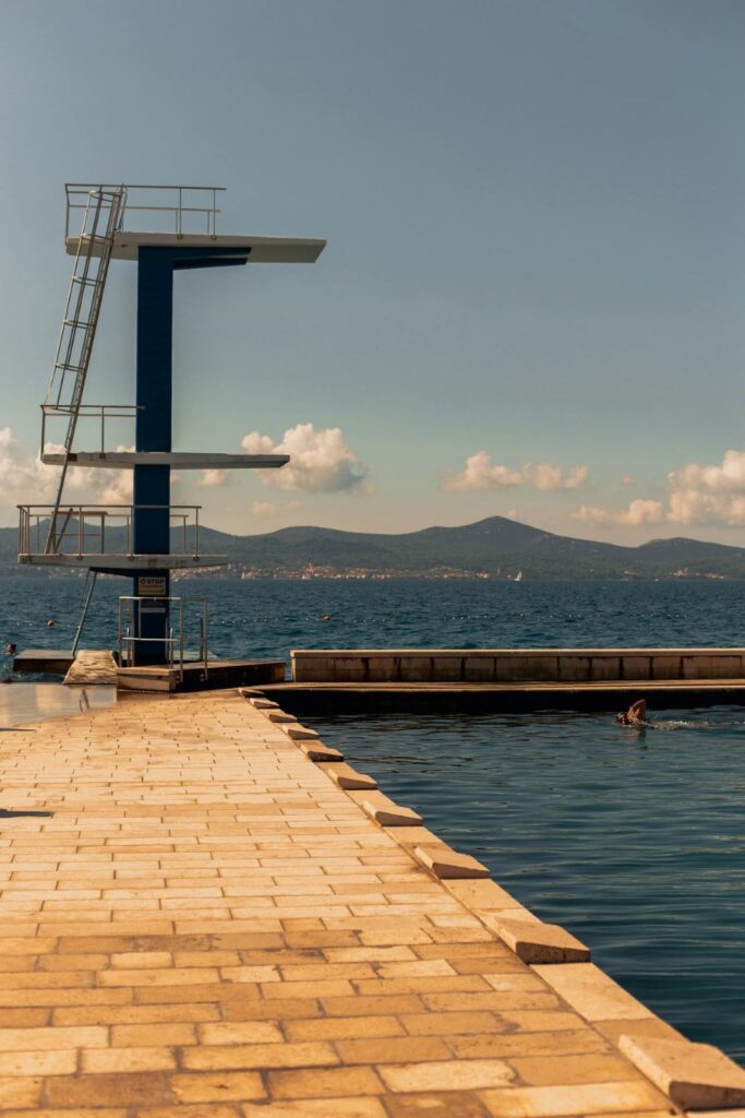 Kolovare Beach, Zadar – A long pebble beach about a 15-minute walk from the old town. There is shade, but like everywhere – shaded areas are very popular so you have to come early in the morning to secure your spot. There are showers and changing cabins, as well as a water park in the sea and bars and restaurants in the area. There is also a sea pool on the beach with a large diving board next to it – perfect for those who enjoy diving 🌊.