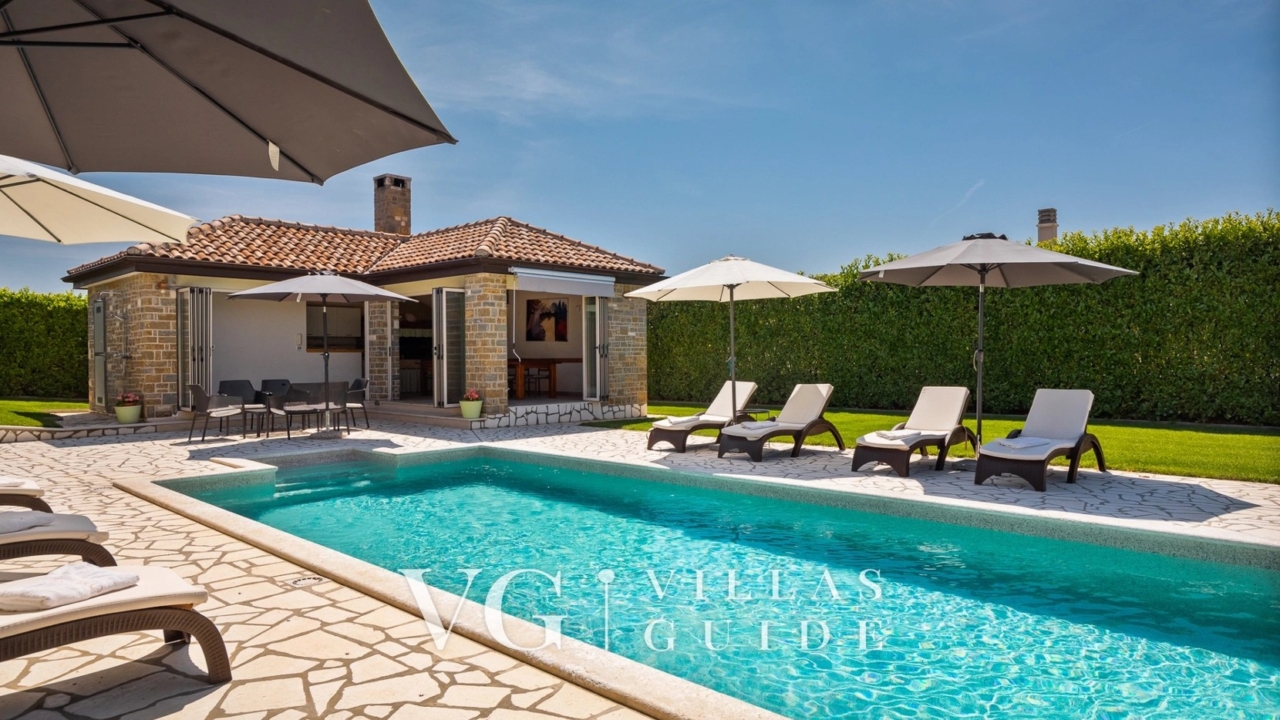 In a small village called Kadumi, just a few kilometers from Poreč, you will find this modern villa that can accommodate up to 8 people. This villa will pamper you with a heated outdoor pool, a hot tub, and a sauna. There is also a covered terrace with a summer kitchen, a barbecue, and a dining table for relaxing evenings in pleasant company.