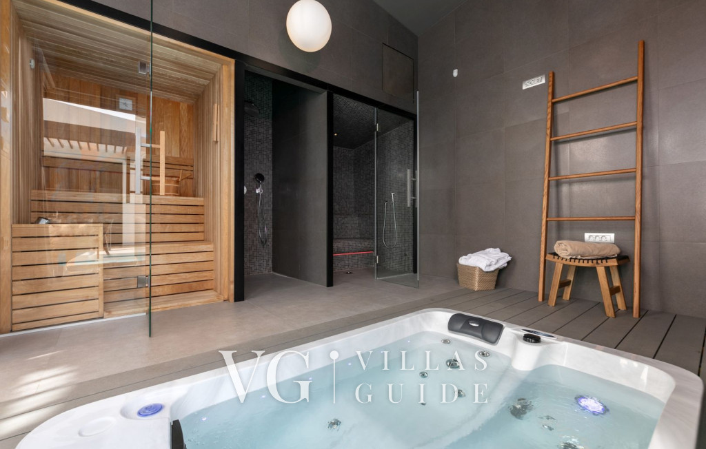 This villa has it all. A private spa with Finnish and steam sauna, an indoor jacuzzi, and a heated outdoor pool with hydromassage. 4 en-suite bedrooms can accommodate up to 8 guests, and a summer kitchen with a barbecue on the terrace is perfect for long evening gatherings. The villa is accessible for people with disabilities and allows pets.