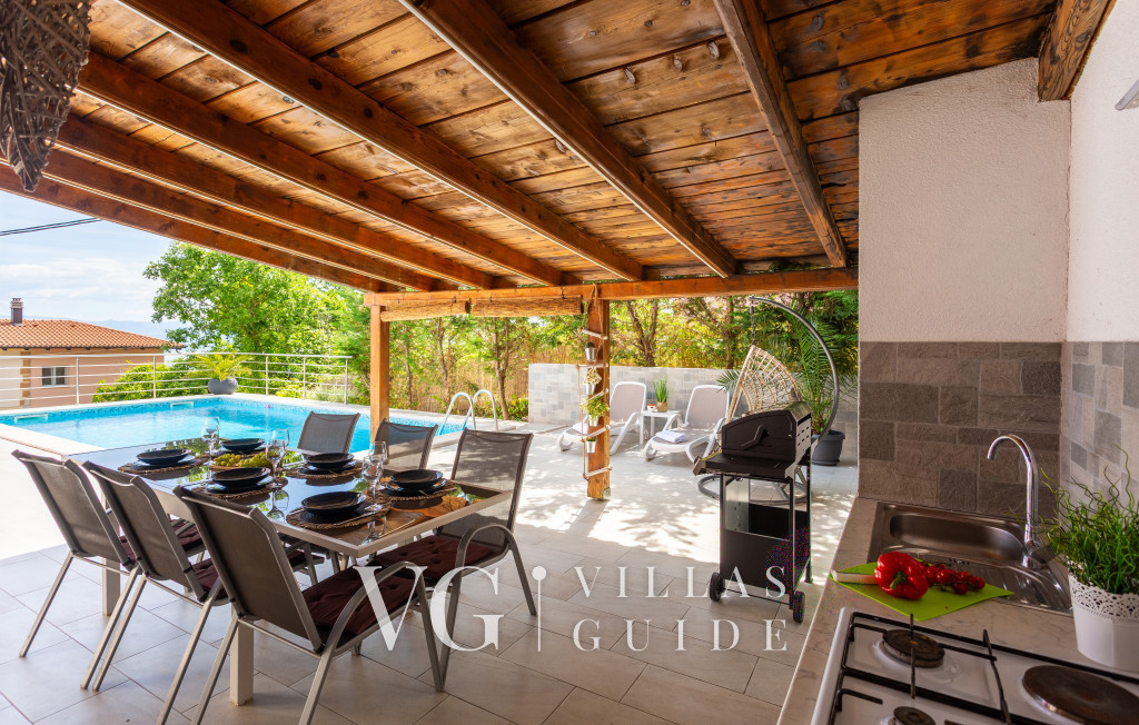 Villa Nino with view - Lovran has a garden with a total surface of 4000 m2. The external facilities of the property include the following: Summer kitchen, Barbecue, Wood-burning grill, barbecue accessories, Covered terrace, Dining table, Lounge area.
