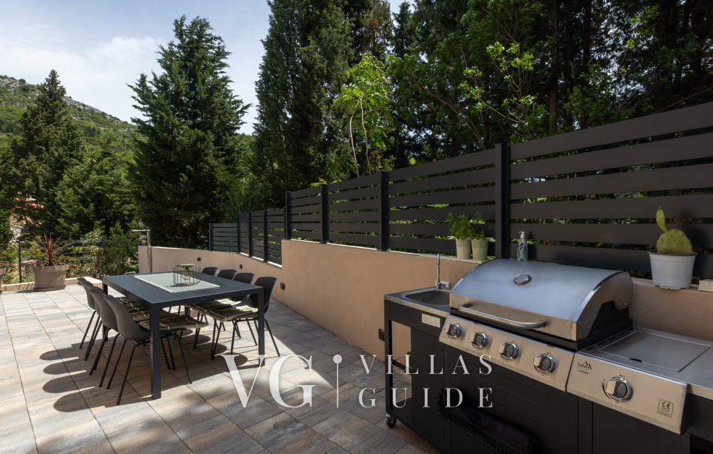 Villa D Cube ima vrt čija površina iznosi 250 m2. Među vanjskim sadržajima objekta dostupno je sljedeće: Roštilj, Plin, Pribor za roštilj, Blagovaonski stol, Lounge zona. Vrt objekta nije u potpunosti ograđen.