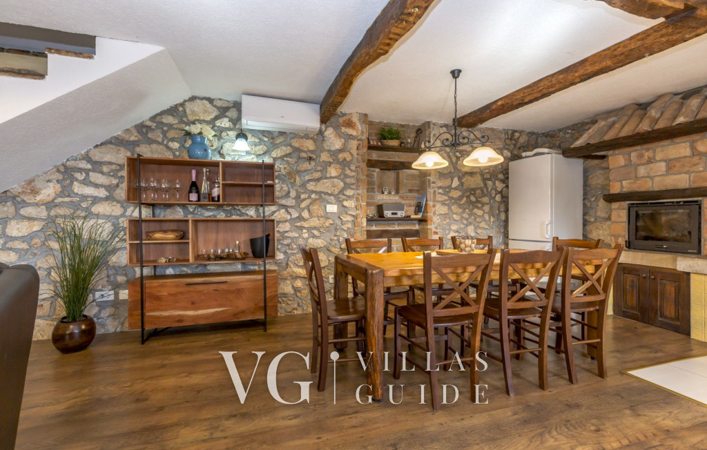 Unutrašnjost kuće veličine je 150 m² te se proteže kroz 3 etaže. U prizemlju se nalazi prostor otvorenog koncepta kojeg čine dnevni boravak i potpuno opremljena kuhinja s blagovaonicom. U kuhinji ćete pronaći baš sve potrebno za pripremu obroka, u kojima možete uživati u unutarnjoj ili pak vanjskoj blagovaonskoj zoni. Cijela je kuća obložena kamenom koji je odličan izolator topline – ljeti održava kuću svježom, a zimi toplom.